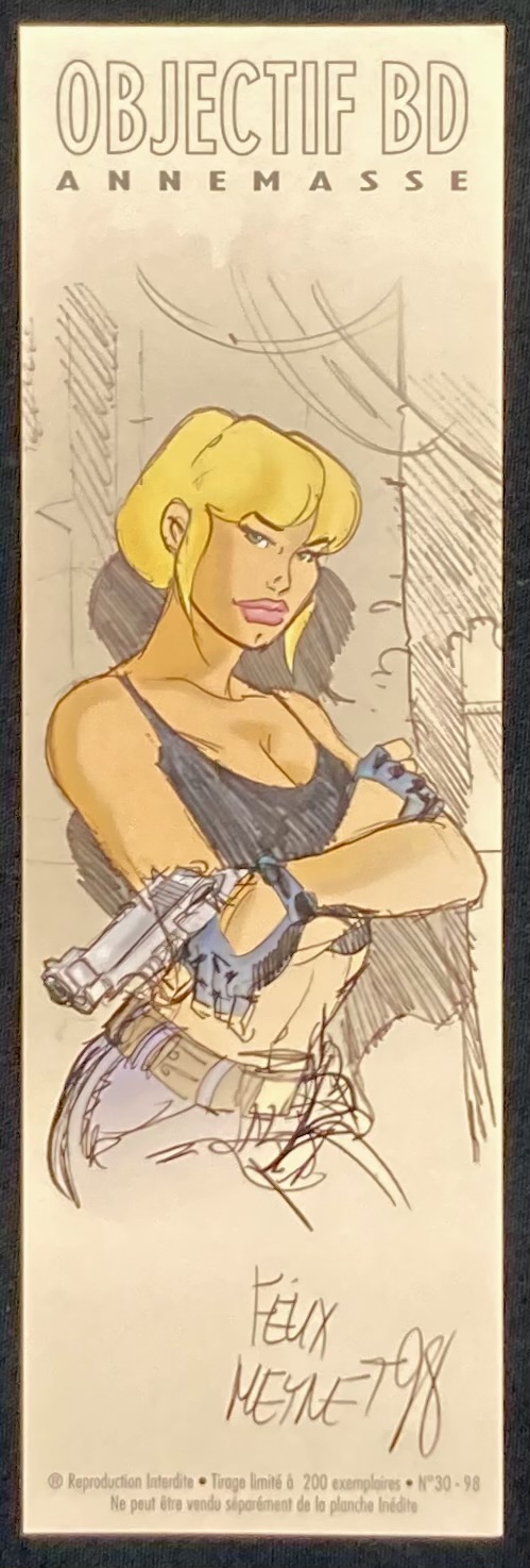 Ce marque page a fait l’objet d’un tirage limité à 200 exemplaires non numéroté et signé par l’auteur. Format: 29,80 cm / 21 cm Dépôt légal: 1998 Editions: Objectif BD – Annemasse Très bon état