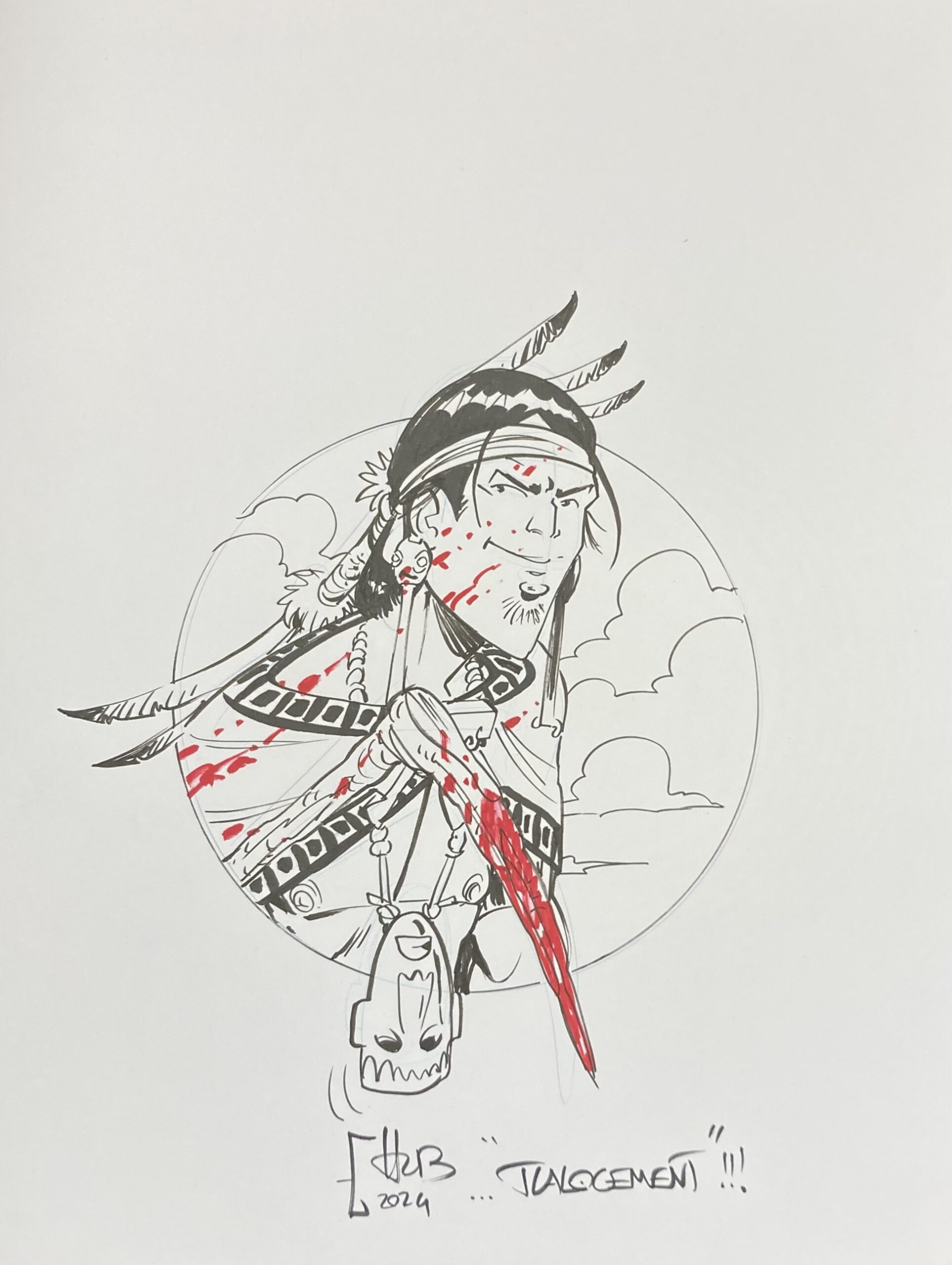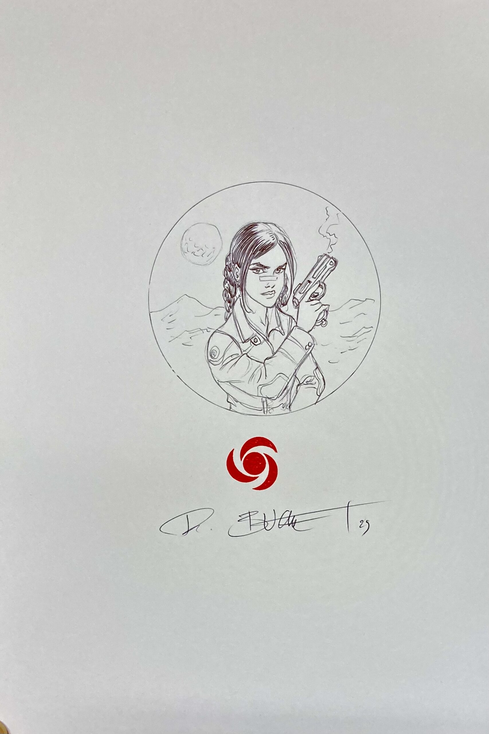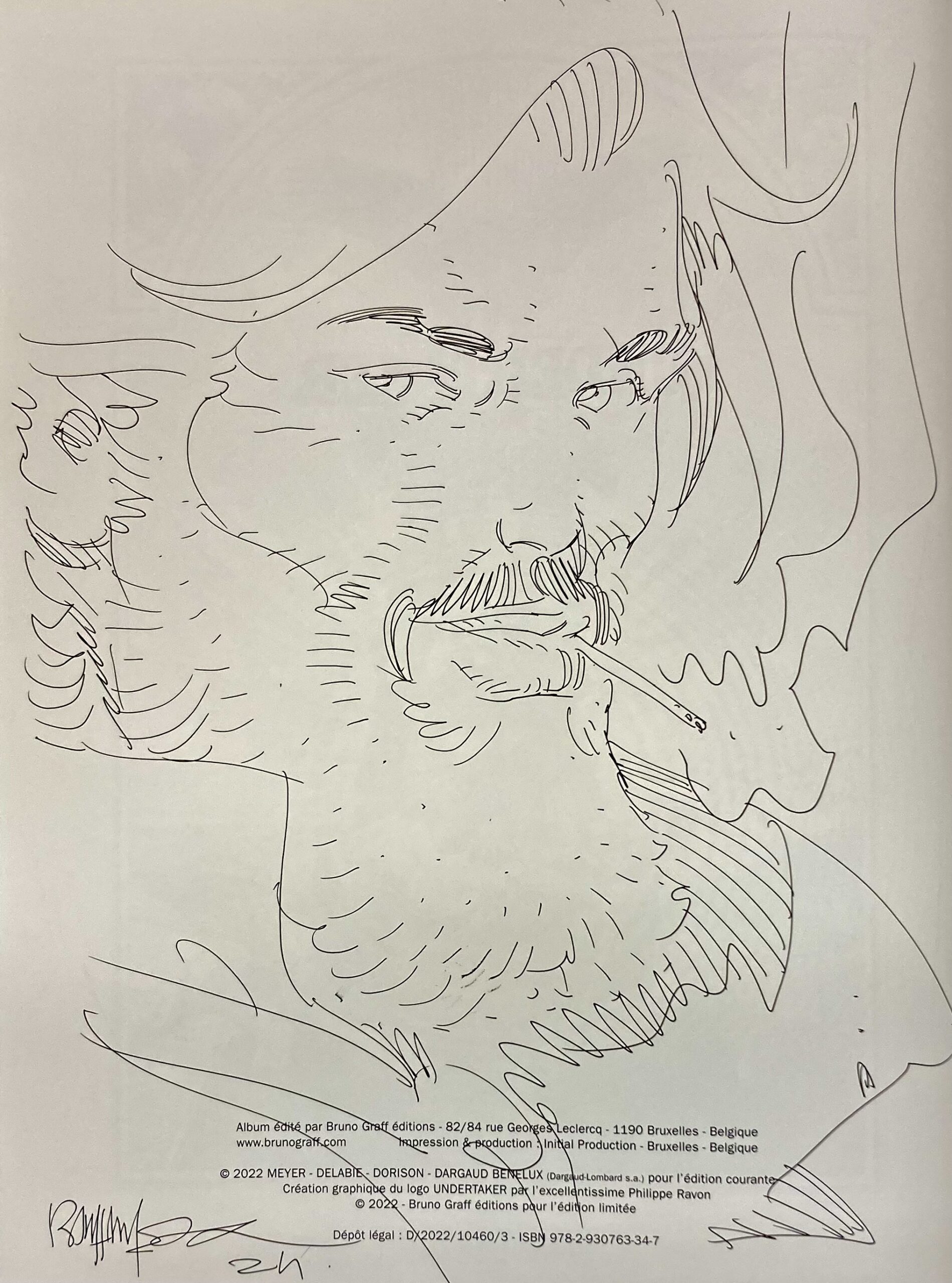 Ce portfolio a fait l’objet d’un tirage limité à 199 exemplaires numéroté et signé par l’auteur sur l’une des 9 pages volantes qu’il contient. Il est agrémenté d’une  superbe dédicace couleurs non nominative. Couverture cartonnée, dos ...