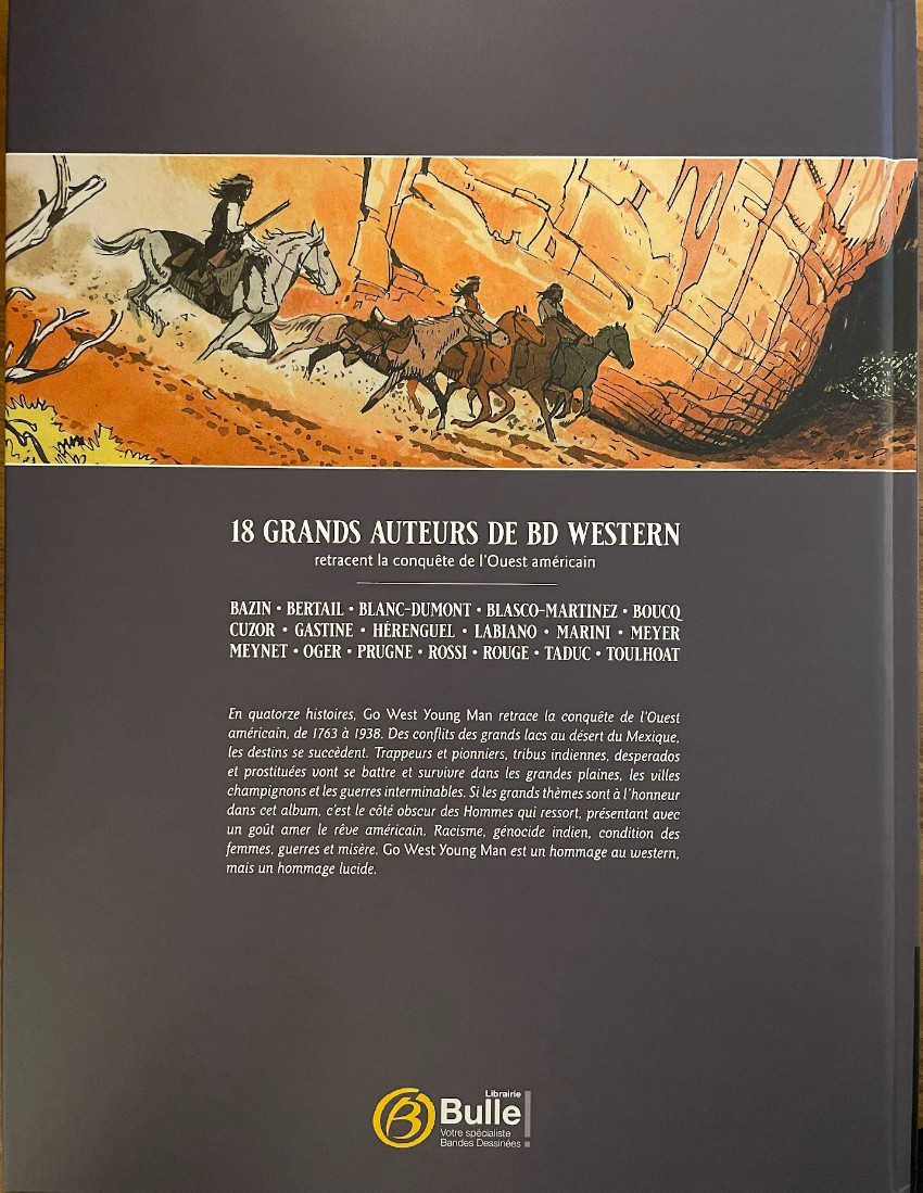 En quatorze histoires, Go West young man retrace la conquête de l’Ouest américain, de 1763 à 1938. Des conflits des grands lacs au désert du Mexique, les destins se succèdent. Trappeurs et pionniers, tribus indiennes, desperados et prostituées vont se battre et survivre dans les grandes plaines, les villes champignons et les guerres interminables. Si les grands thèmes sont à l’honneur dans cet album, c’est le côté obscur des Hommes qui ressort, présentant avec un goût amer le rêve américain. Racisme, génocide indien, condition des femmes, guerres et misère. Go West young man est un hommage au western, mais un hommage lucide.