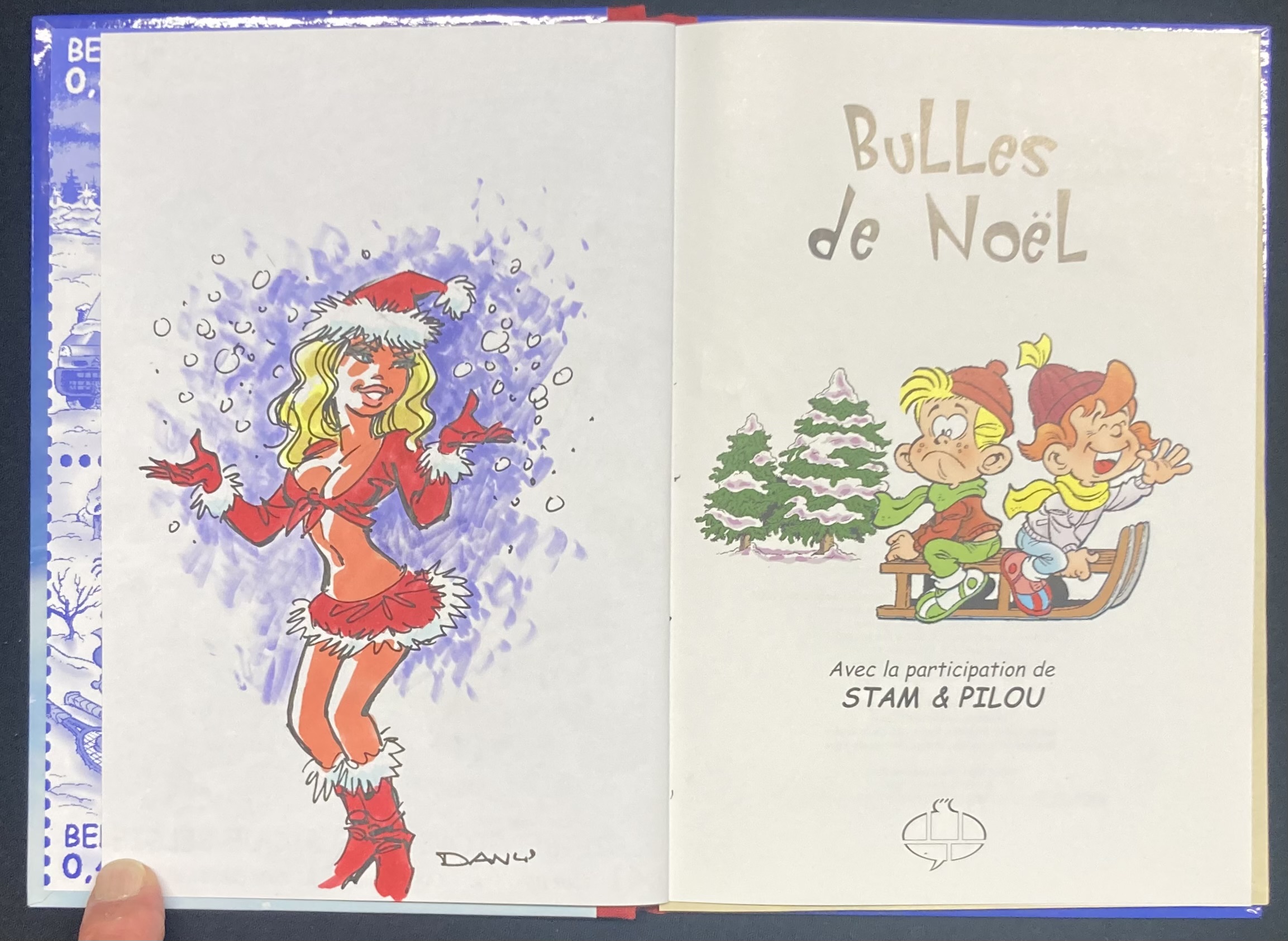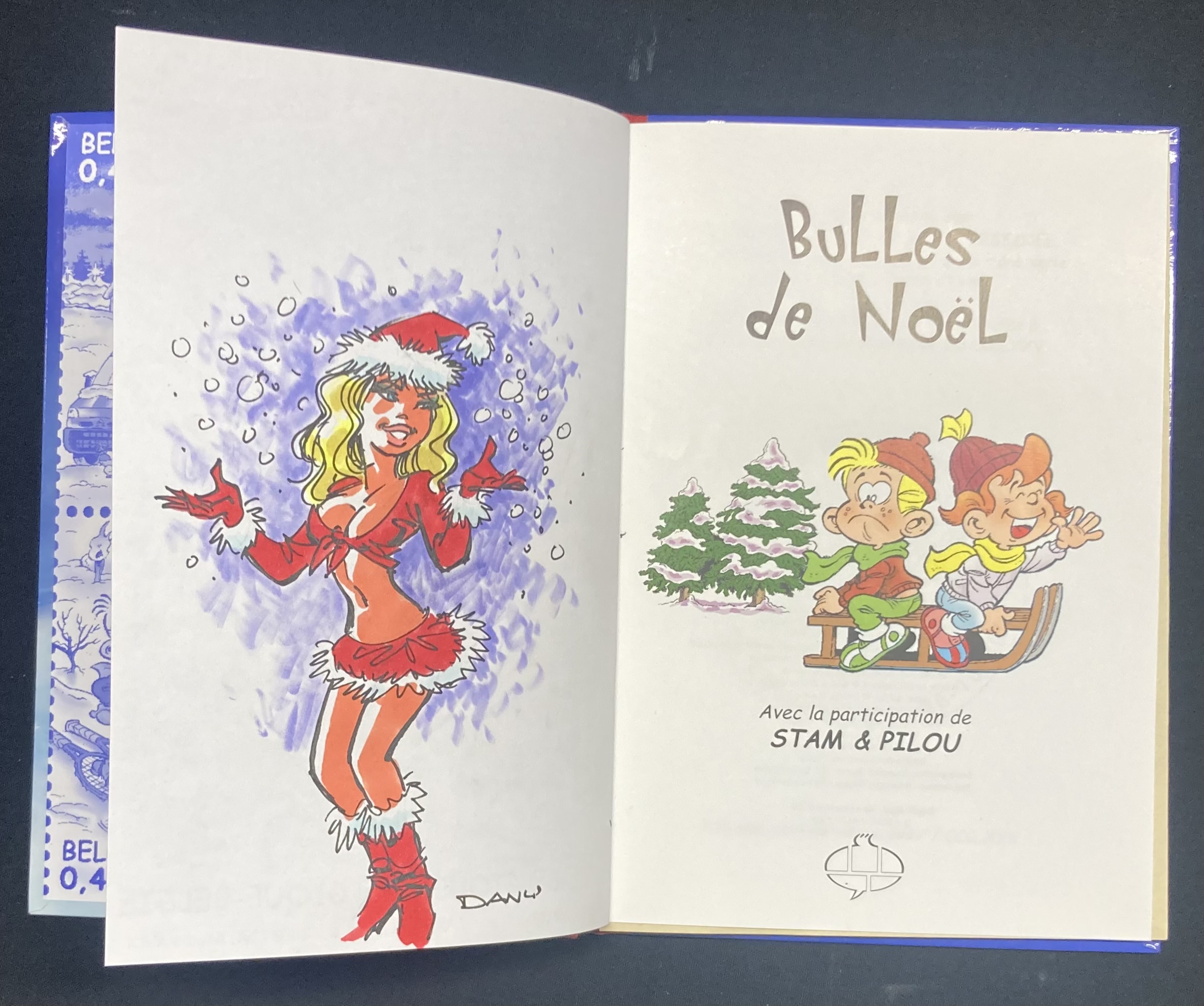 Cet ouvrage est agrémenté d’une superbe dédicace couleurs non nominative. Il a été édité par le Centre Belge de la Bande Dessinée et La Poste belge à l’occasion de l’émission d’une série de timbres consacrés à Noël. Après un texte sur la tradition de Noël dans la bande dessinée, ce recueil nous propose de découvrir sept courts récits ou gags dessinés par Dany (Olivier Rameau), Fournier (Spirou et Fantasio), Dupa, Macherot (Sibylline), Hausman, Will, De Marck & De Wulf (Stam et Pilou), sur le thème de Noël.