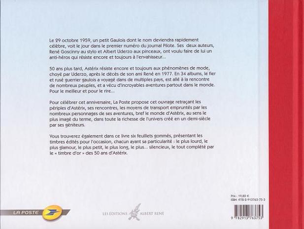 Pour célébrer l’anniversaire d’Astérix, La Poste propose un ouvrage intitulé »Le timbre voyage avec… Astérix » retraçant les périples de notre héros, ses rencontres, ou les moyens de transport empruntés par les nombreux personnages de ses aventures. Devenez incollable sur les secrets du monde d’Astérix qui durent depuis un demi-siècle ! Ce livre contient en plus 6 feuillets gommés présentant les timbres édités pour l’occasion, chacun ayant sa particularité : le plus lourd, le plus glamour, le plus petit, le plus long, le plus silencieux… le tout complété par le »timbre d’or » des 50 ans d’Astérix. La préface est signée Sylvain Augier, les textes sont d’Olivier Andrieu. Les chapitres sont articulés autour du voyage : – les voyages des auteurs avec une interview exclusive d’Uderzo, – le village, point de départ des aventures, – les voyages à travers la Gaule, – les voyages au delà de nos frontières, – les moyens de transport utilisés (bateaux, chars, etc.), – les personnages rencontrés, – et enfin Astérix et La Poste.