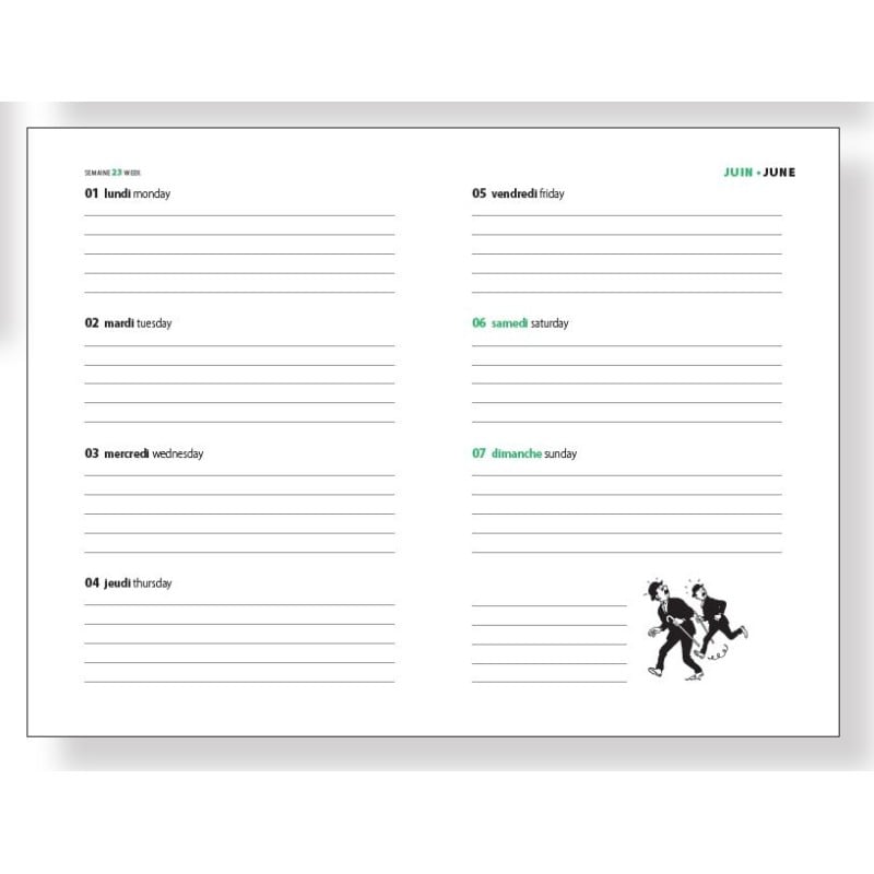 Les aventures de Tintin et Milou nous offrent d’innombrables images sur le monde. Reflets d’une époque, miroir du vingtième siècle, elles sont autant de témoins, vivants et animés, de la vie du célèbre petit reporter au pays de la fiction. Hergé, le créateur de la série au succès planétaire, nous gratifie d’instantanés sur les thèmes les plus variés. Mais le moteur principal de cette grande fresque tout en bulles et en cases, c’est l’action. Sur terre, sur mer, sous l’eau ou dans les airs, Tintin est partout. Il grimpe, nage, escalade, saute en parachute, monte à cheval. En scaphandre ou sur la selle d’un vélo, notre héros est toujours dans son élément. Les Dupondt, le professeur Tournesol ou encore le général Alcazar ne sont pas en reste. Ces activités physiques, utiles à la bonne conduite du récit, font maintenant partie intégrante de notre civilisation des loisirs, des loisirs en action. L’utile a définitivement rejoint l’agréable. Agenda et calendrier sont les indispensables outils d’une organisation efficace. Dans ce domaine, le papier revient en force et continue de combler ceux qui aiment percevoir sa fibre au passage de la pointe du stylo ! Simples d’utilisation, d’un format maniable et étudié, nos agendas offrent un espace d’écriture confortable et pratique. Ils permettront de retrouver au fil des semaines les visuels les plus emblématiques des aventures de Tintin ! À travers les jours, les semaines et les mois de l’année 2026, retrouvez la beauté d’un dessin d’exception au service d’une histoire sans égale.