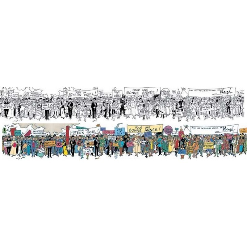 Rare carte de voeux Hergé non signée en 4 volets, dépliants formant une frise, illustrée d’un coté en couleurs et au verso en noir et blanc par une composition originale