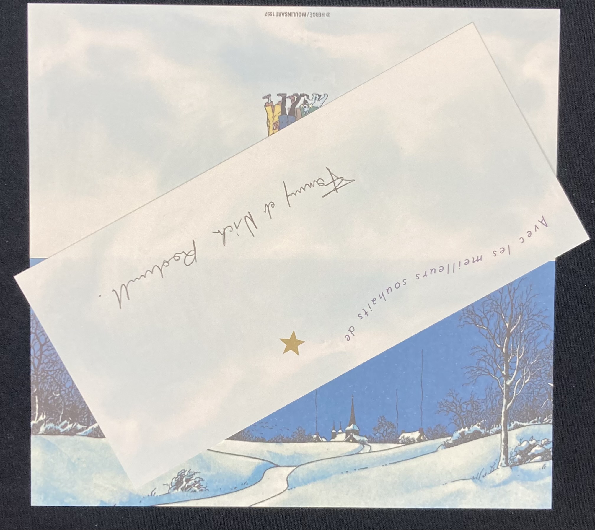 Carte de voeux de 1997 des Studios Hergé pliée en 2 signée Fanny et Nick Rodwell sur une feuille volante, complet de son enveloppe.