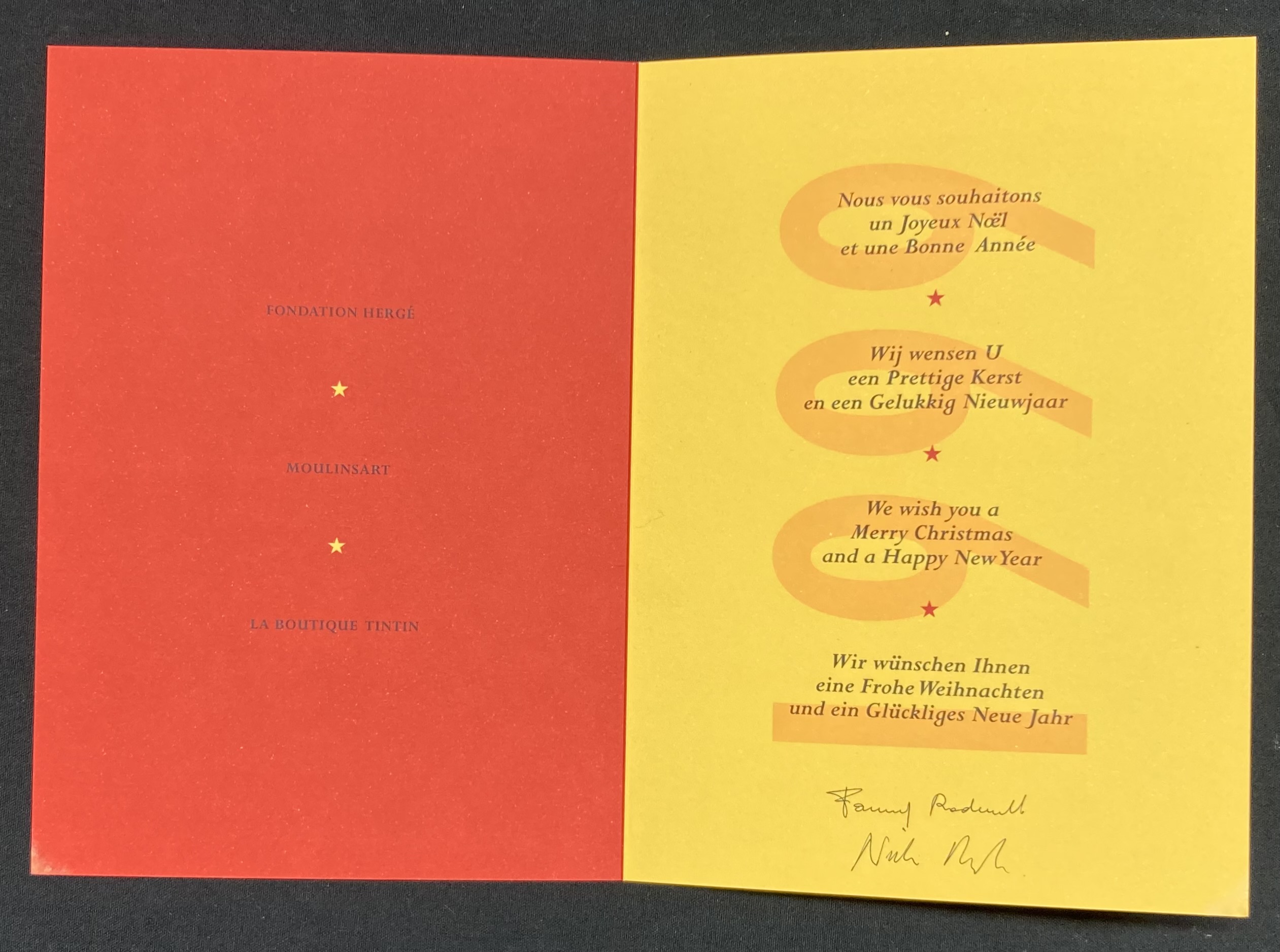 Carte de voeux en diptyque de 1998 pliée en 2 signée par Fanny & Nick Rodwell.