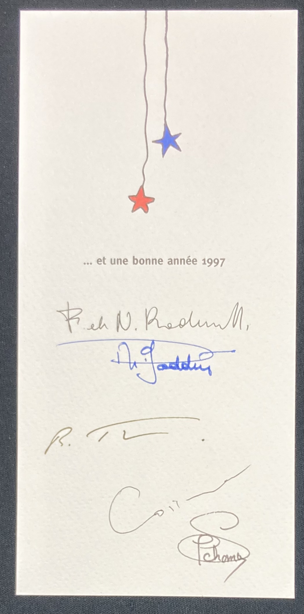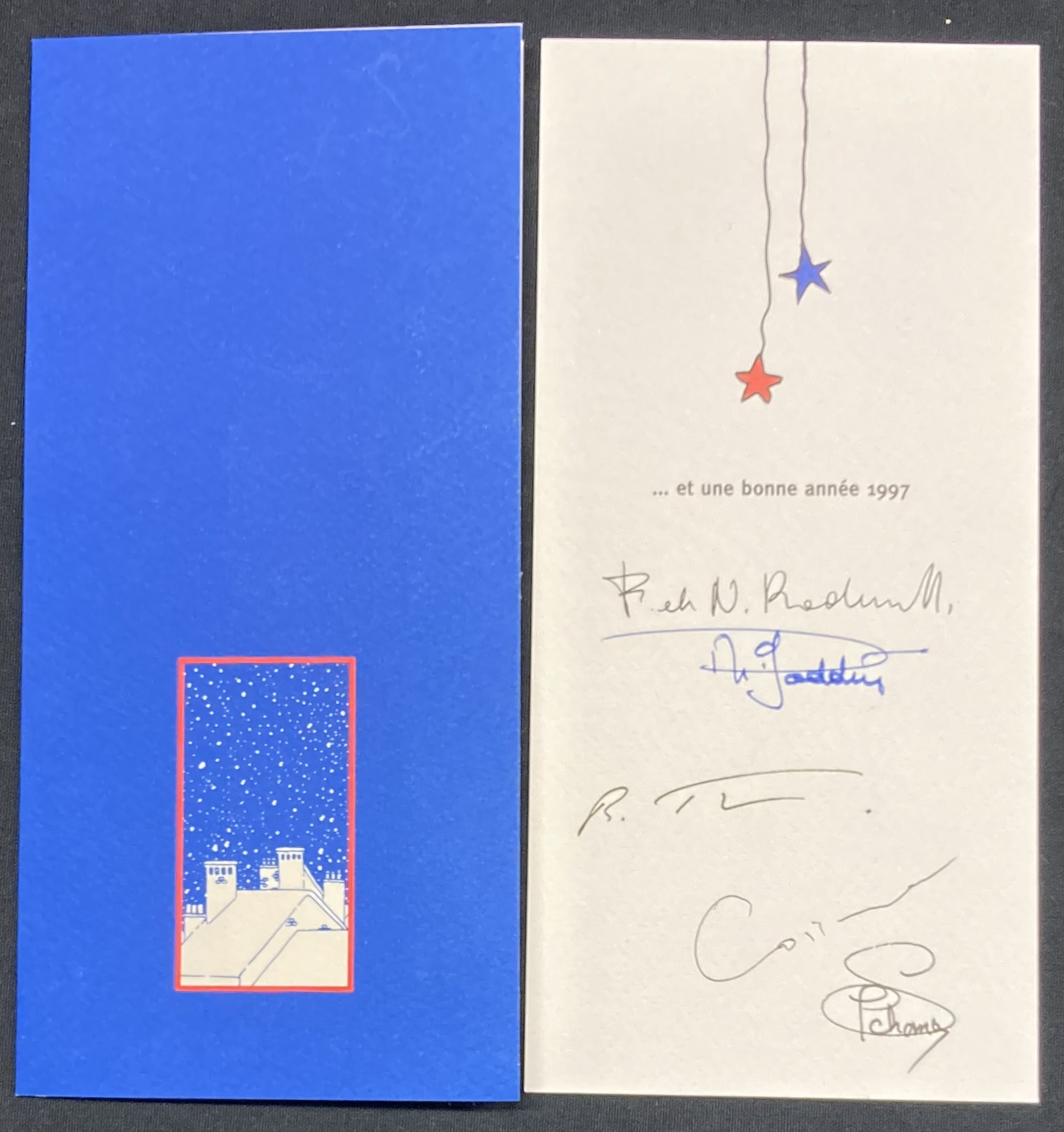 Carte de voeux en diptyque Pop-Hop de 1997 de la fondation Hergé pliée en 2 signée sur une feuille volante par Fanny & Nick Rodwell, P. Goddin et 2 autres non déchiffrées.