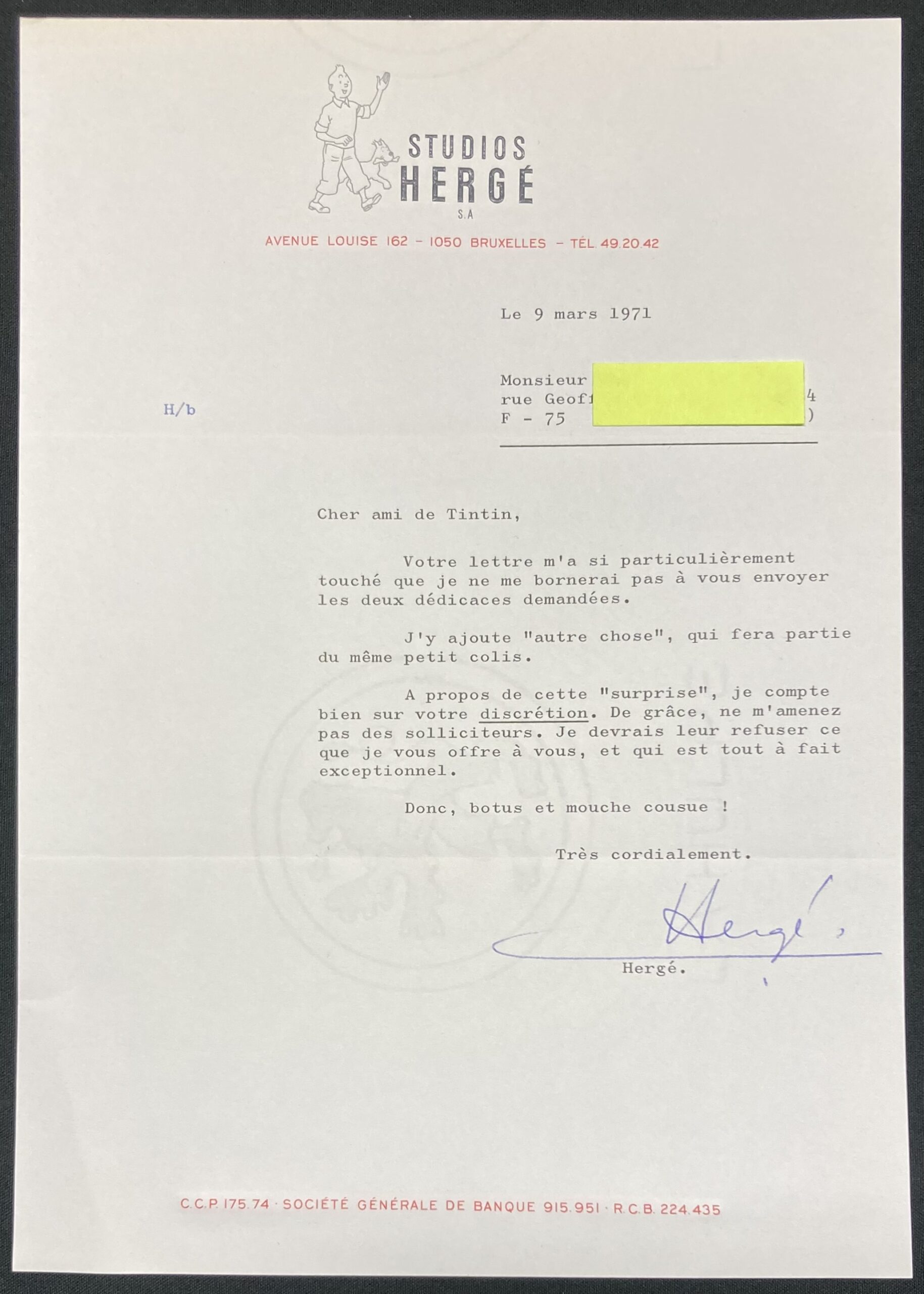 Lettre de Hergé pour un collectionneur daté du 09 mars 1971 pliée en 3 – signée. Le nom du destinataire est sous le post-it vert à la demande des ayants droits?