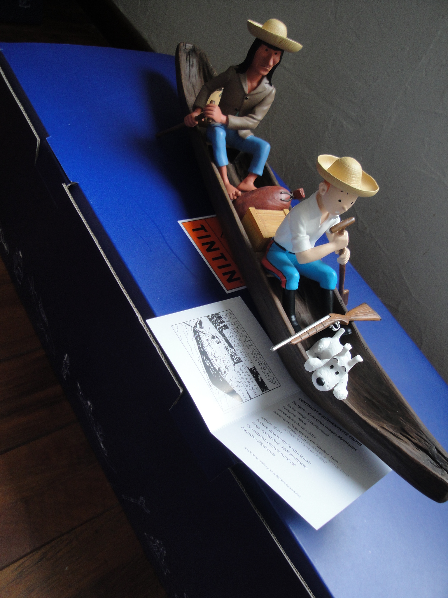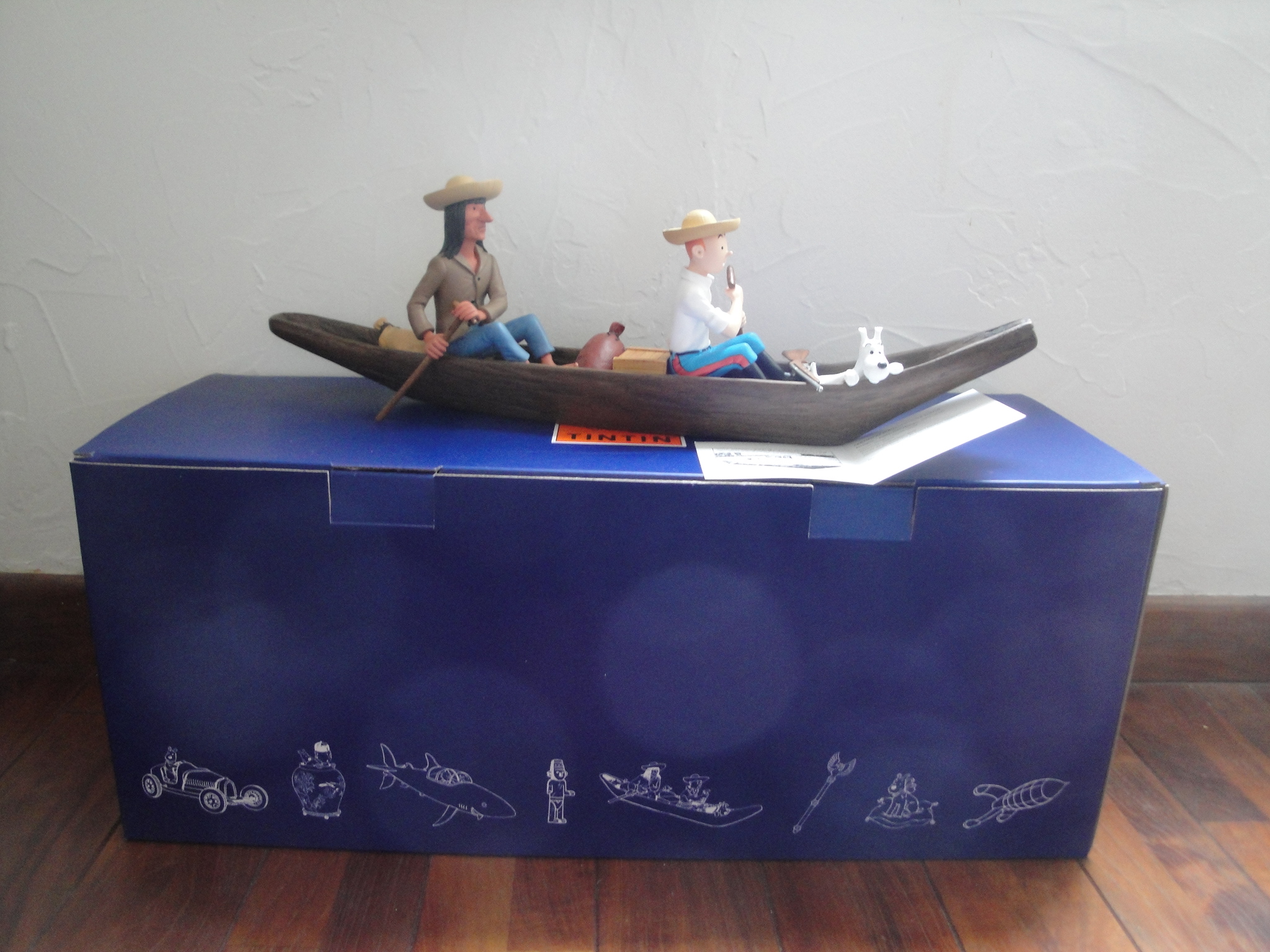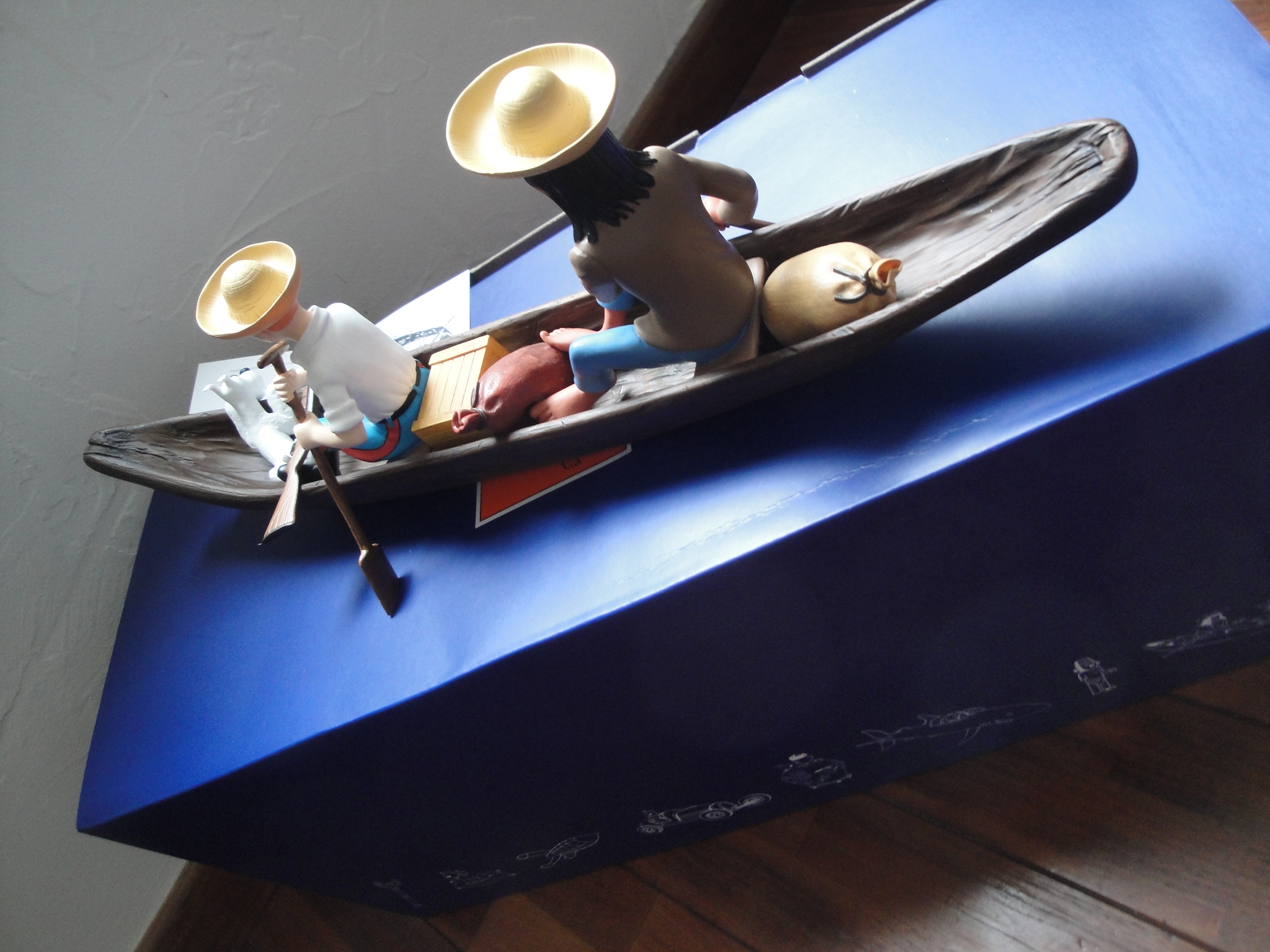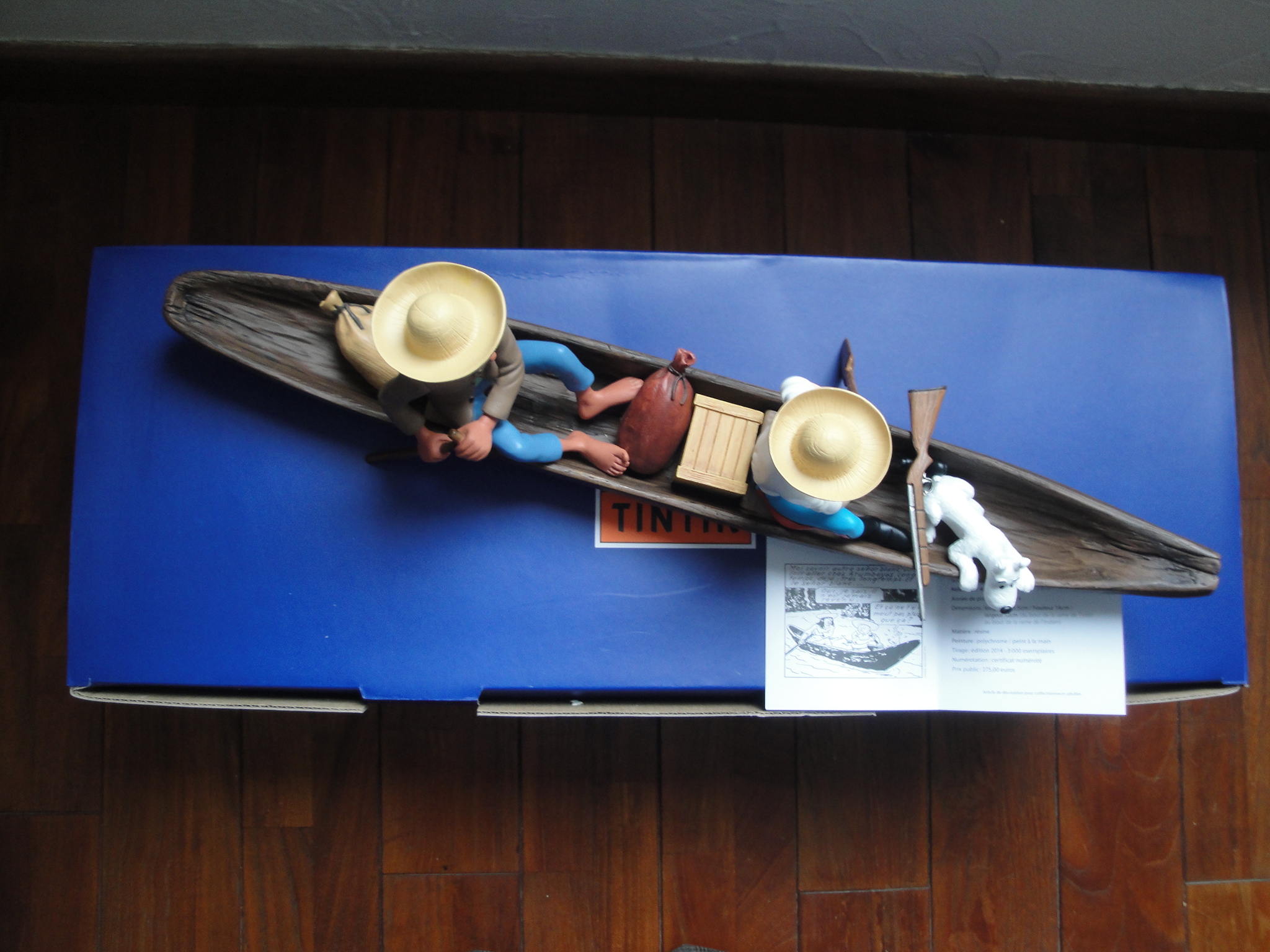Dimensions: longueur 45,50 cm / hauteur 14 cm / largeur 12 cm ( du bout de la rame de Tintin au bout de la rame de l’Indien ).