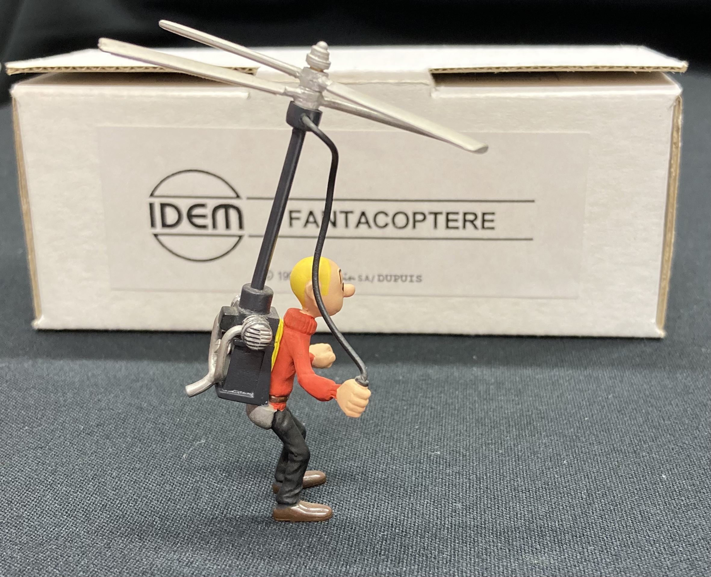 Epuisé depuis des années, la reproduction à l’échelle 1/43e ( = standard des miniatures autos/trains ) de la Fantacoptere des aventures de Spirou & Fantasio est une réalisation de Idem et Serge Leuba en alliage étain/plomb, matériau inaltérable. Peinture polyuréthane pour la carrosserie. Objet très recherché. Avec sa boîte d’origine.