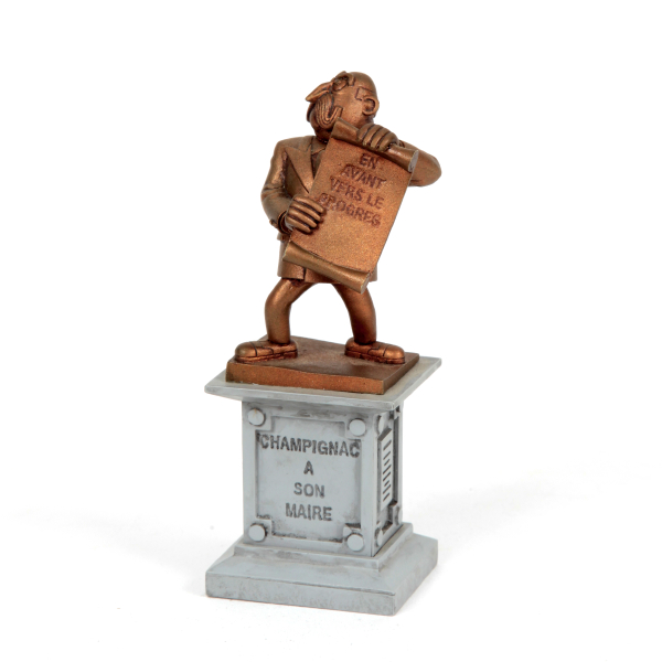 Epuisé depuis des années, la reproduction à l’échelle 1/43e ( = standard des miniatures autos/trains ) de la statue du Maire de Champignac avec sa lettre hommage (plus rare) des aventures de Spirou & Fantasio est une réalisation de Idem et Serge Leuba en alliage étain/plomb, matériau inaltérable. Peinture polyuréthane pour la carrosserie. Objet très recherché. Avec sa boîte d’origine.