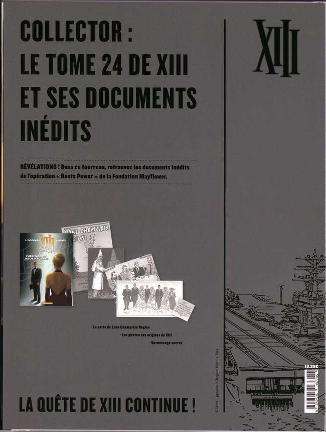 Dans ce 24e tome de la série XIII, Sente et Jigounov mettent Jason Mac Lane et la Fondation Mayflower face à face. Tous les moyens sont bons pour la Fondation qui tente de récupérer les documents que Jason a en sa possession. Jones et Carrington sont menacés de mort et il reste à XIII à comprendre au plus vite son passé s’il veut sauver ses amis… et le gouvernement américain lui-même. Dans cette course contre la montre, XIII découvrira son incroyable héritage, ses illustres ascendants et, plus proche de nous, le commanditaire du meurtre de son père adoptif…