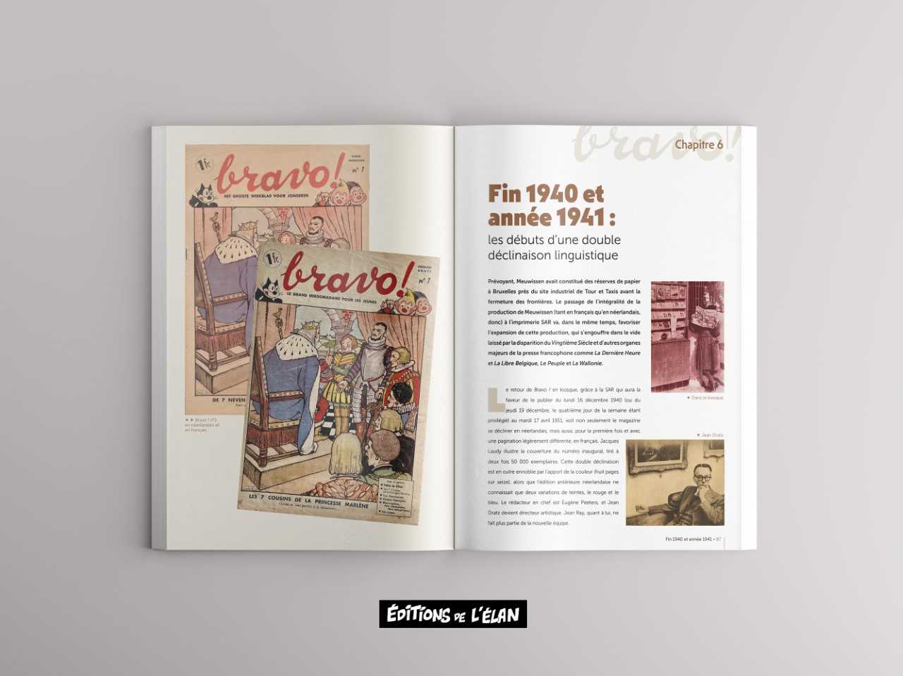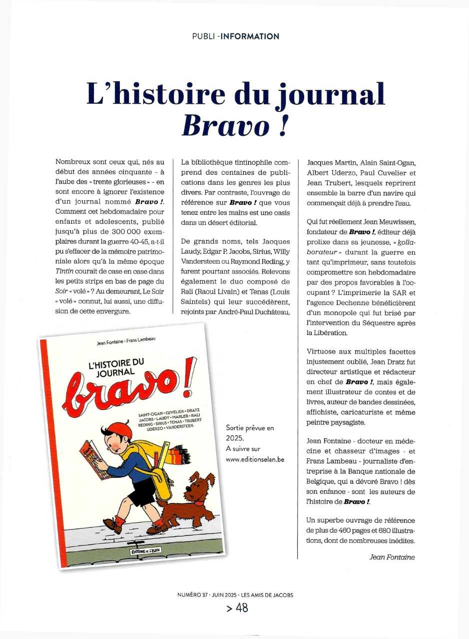L’histoire du journal Bravo! n’est pas seulement le récit d’un hebdomadaire pour enfants, c’est une authentique page d’Histoire dans le contexte de la Seconde Guerre mondiale et de la Libération, de la collaboration, du séquestre, de l’essor de la bande dessinée belge. Bravo! a navigué dans les remous de la guerre, mais à l’aube des années 50, il prend l’eau et touche le fond, ignoré par les générations d’après-guerre… Dans ce magazine, de grands noms de la BD ont commencé leur prestigieuse carrière : E.P.Jacobs, W. Vandersteen, J. Martin sous le pseudonyme de Marleb, Uderzo, Sirius, Cuvelier, Trubert, Dratz, Tenas, Laudy, Rali, Reding, et bien d’autres… Saint-Ogan a poursuivi la sienne débutée en 1925.