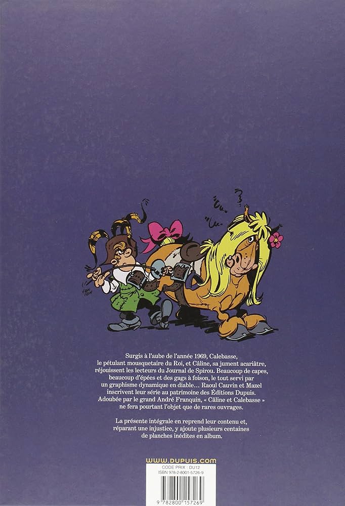 Jeune et fringant mousquetaire, Calebasse nous fait vivre de trépidantes aventures en compagnie de sa fidèle mais non moins caractérielle jument, l’irascible Câline. Malgré un succès certain, la série connaîtra peu de publications en album – ce qui explique que nombre d’histoires courtes de Câline et Calebasse soient depuis longtemps devenues introuvables. Cette intégrale vient combler ce manque, en réunissant, dans le présent volume, des histoires au long cours telles que « Les Mousquetaires », « Les Joyaux de la reine », ou encore « À l’ombre de la Bastille » ; des histoires courtes comme « Le Diamant noir » ou « Les Mousquetaires du printemps » ; ainsi que des illustrations et des couvertures parues dans Le journal de Spirou.